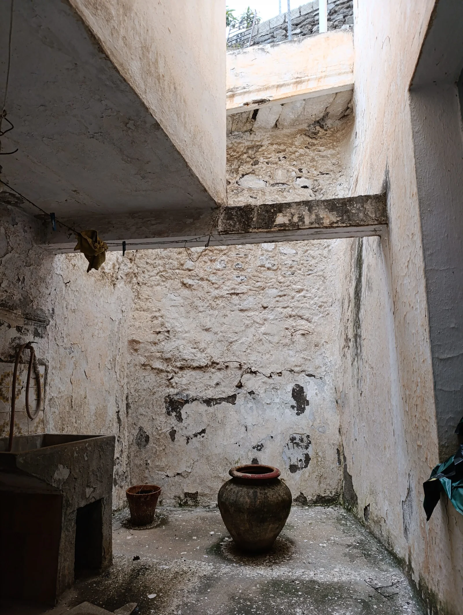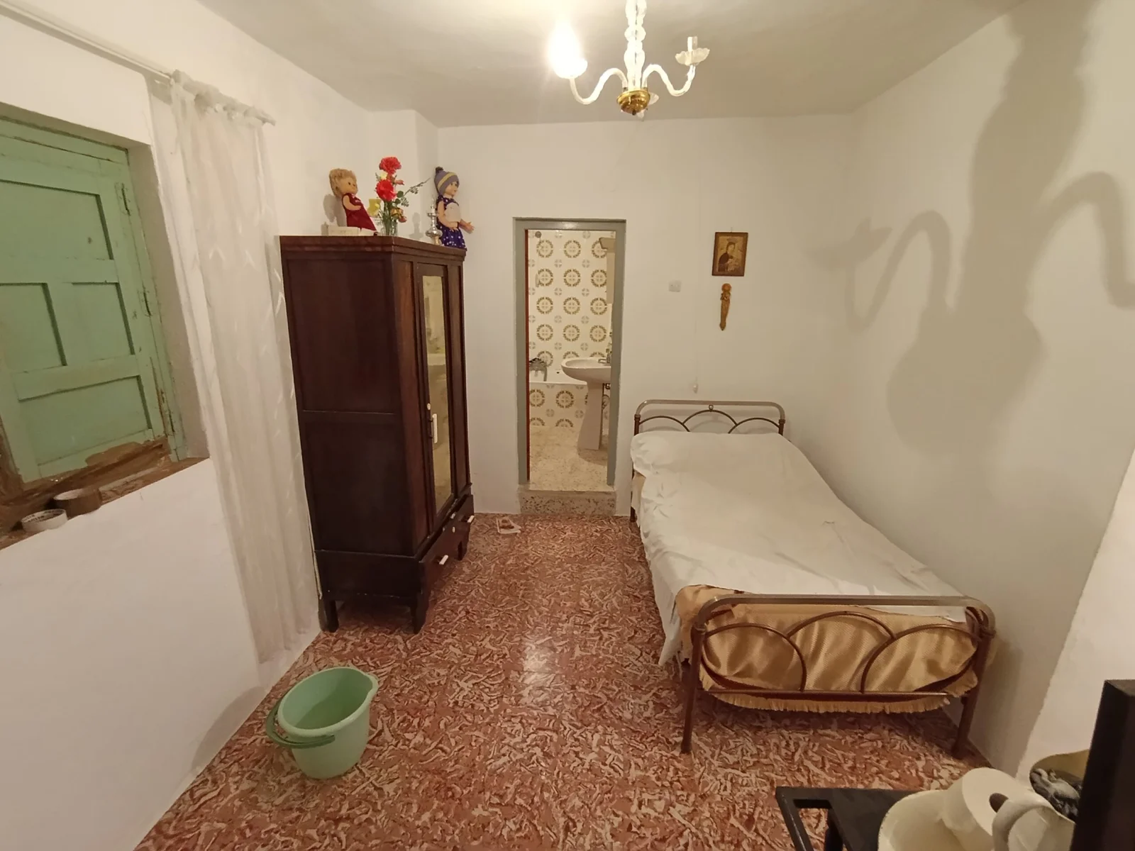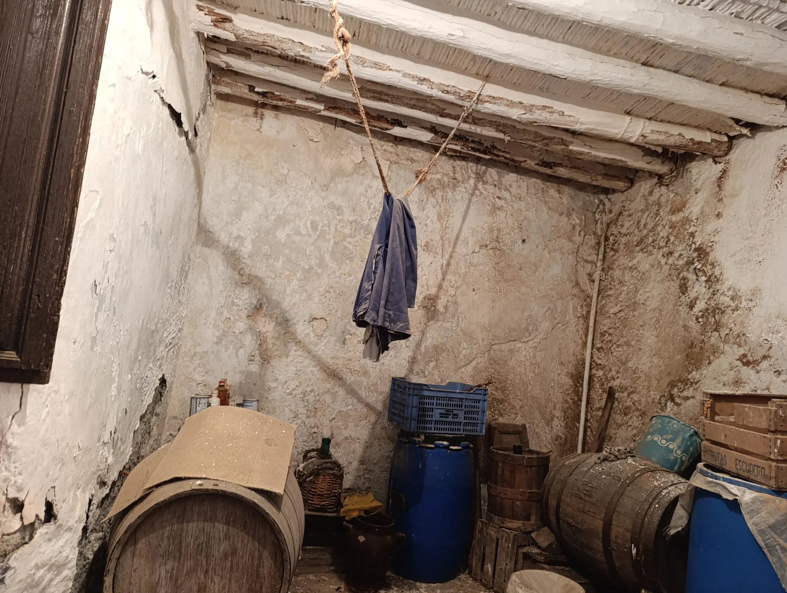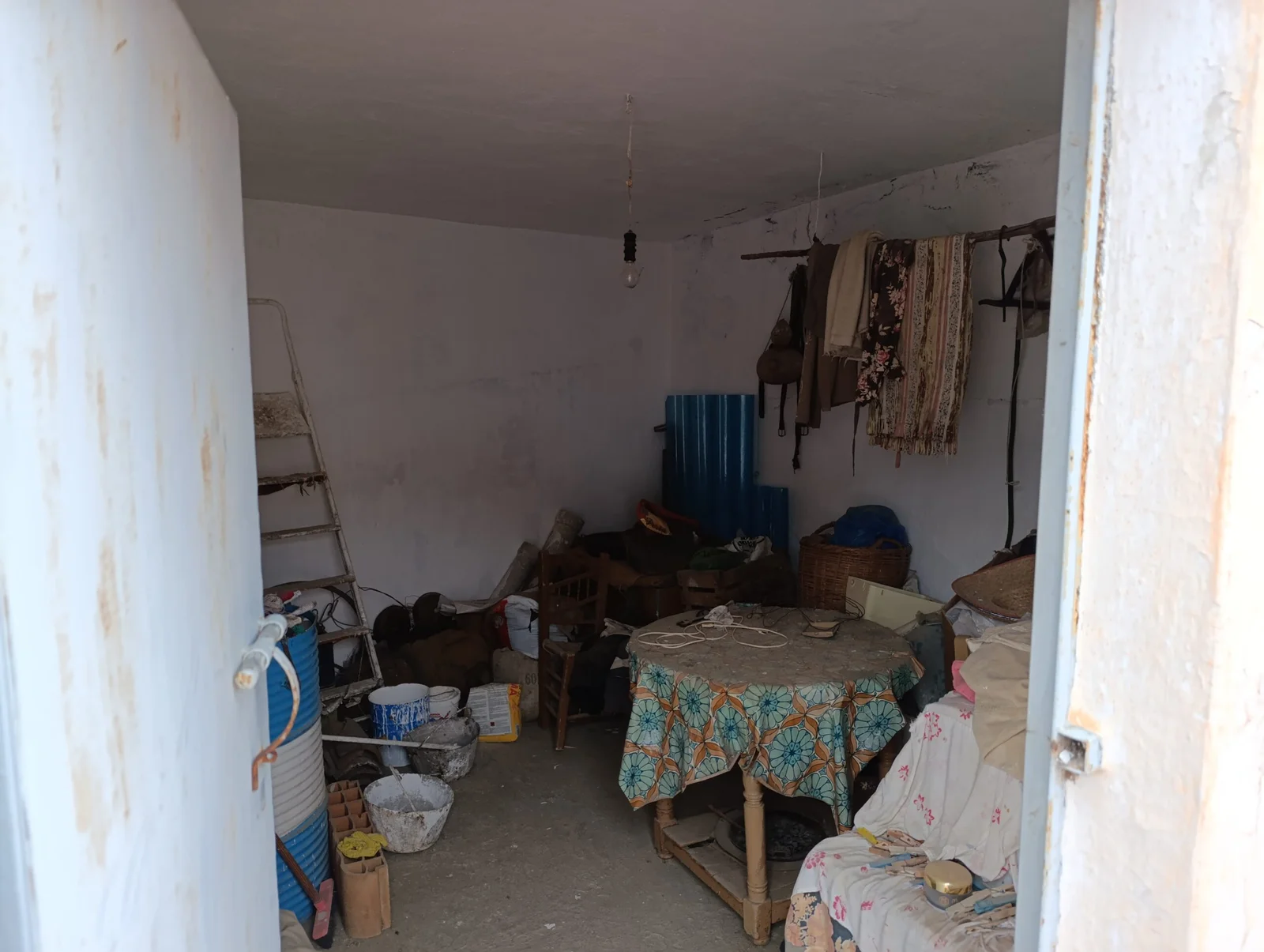 En planta baja: un salón, una sala de estar, una habitación, cocina, patio con aseo y bodega. En planta primera: baño completo, cuatro dormitorios, uno de ellos con balcón. La azotea es amplia y tiene una cámara cerrada con puerta y ventana.